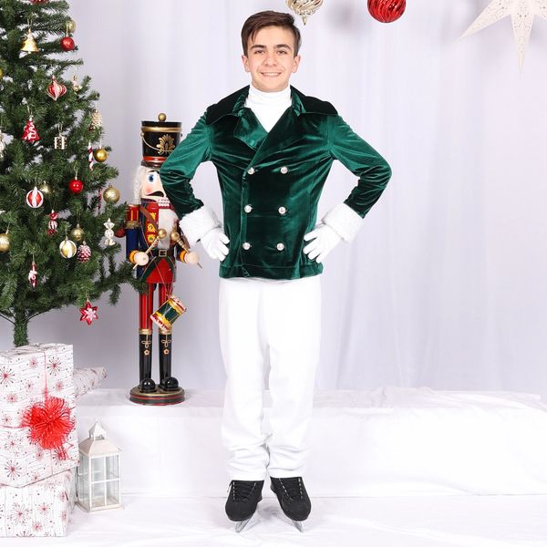 Inclus : Col roulé blanc, pantalon blanc, gants blanc et veston vert en velour
